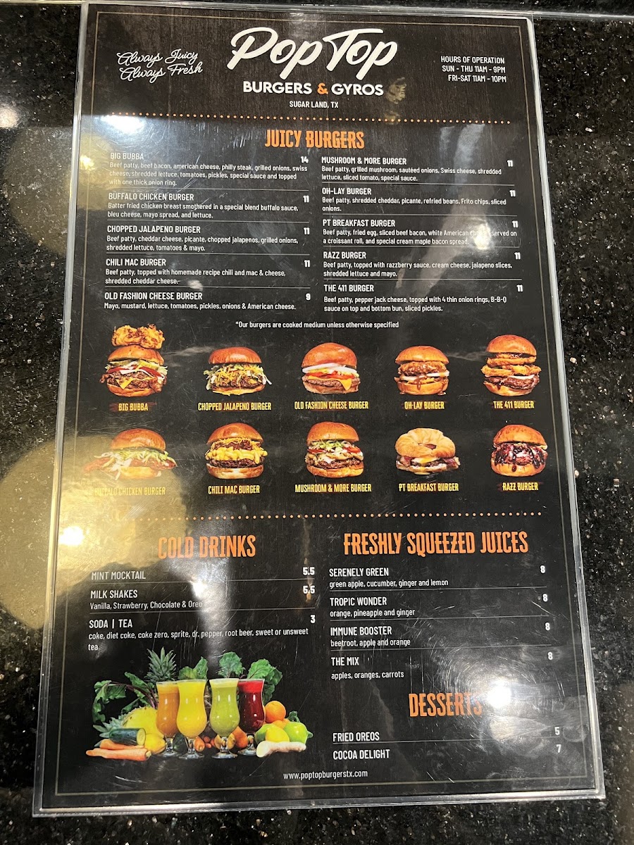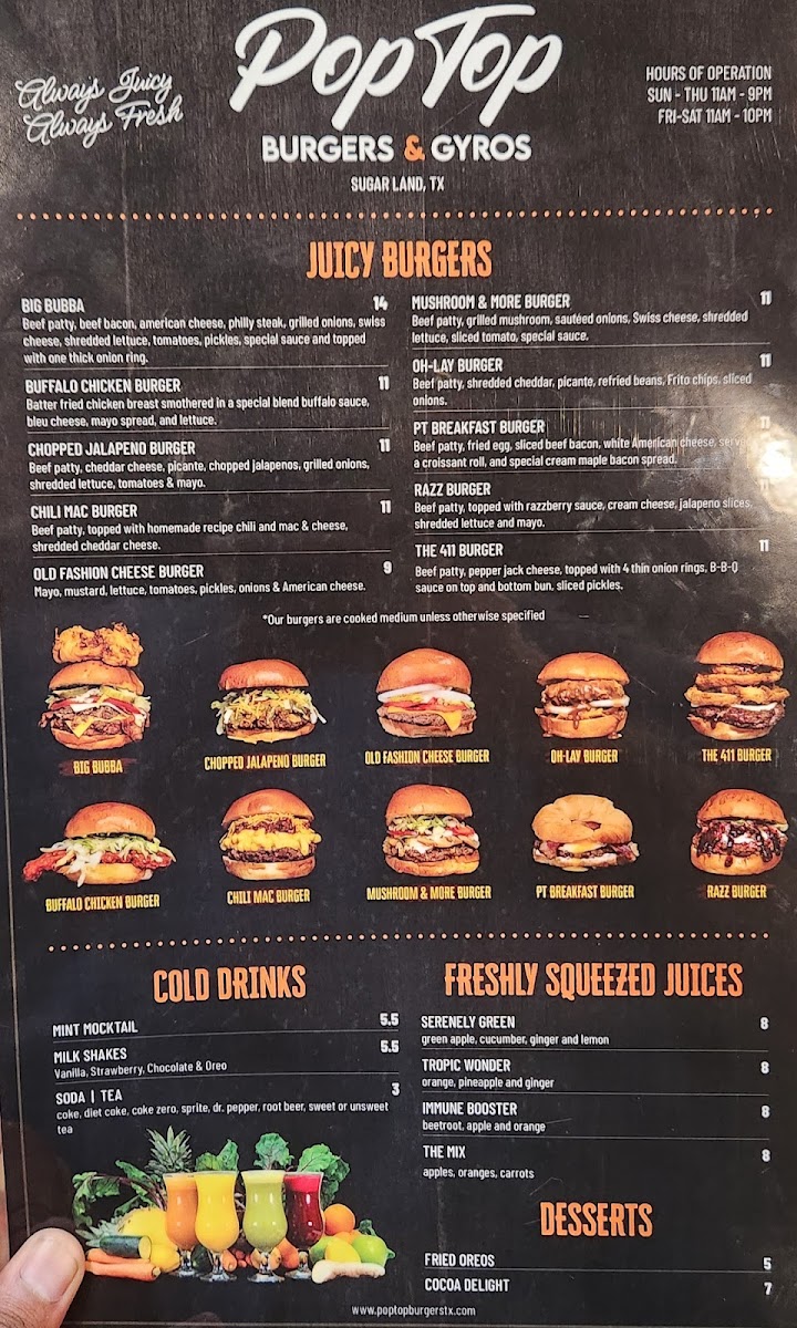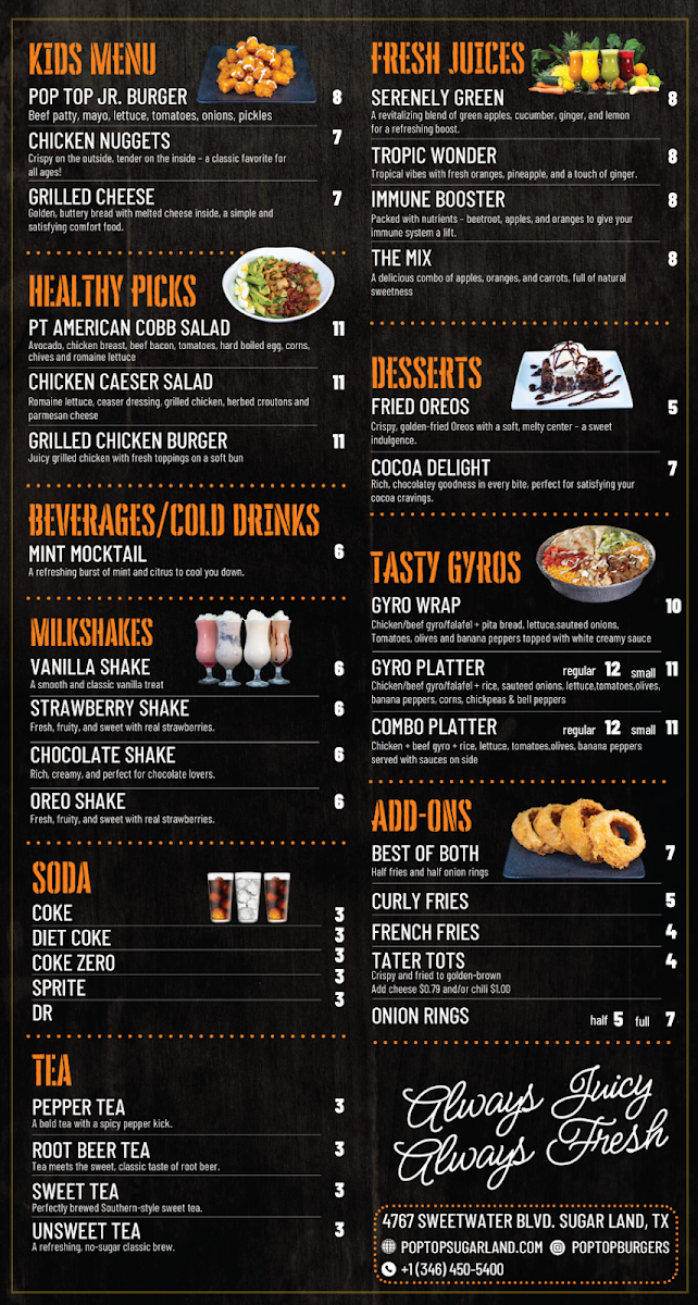 Welcome to Pop Top Burgers & Gyros, a delightful fast-food gem nestled in Sugar Land, Texas. At this vibrant eatery, the menu is a scrumptious fusion of classic American burgers and savory gyros. You’ll find mouthwatering options like the Grilled Chicken Burger and the indulgent Mushroom and More burger, which have garnered rave reviews for their juicy, flavorful bites. Salads, such as the American Cobb Salad, offer satisfying healthy choices without skimping on taste.