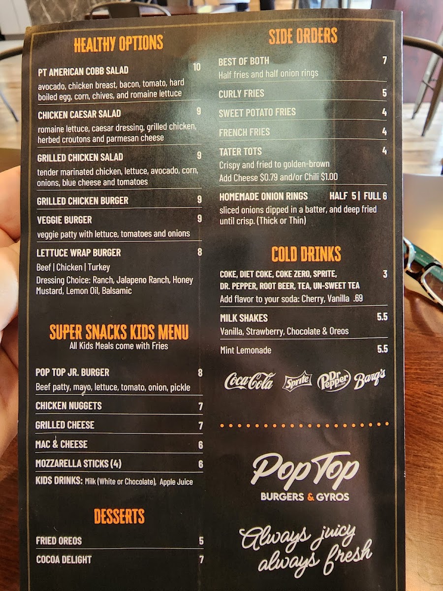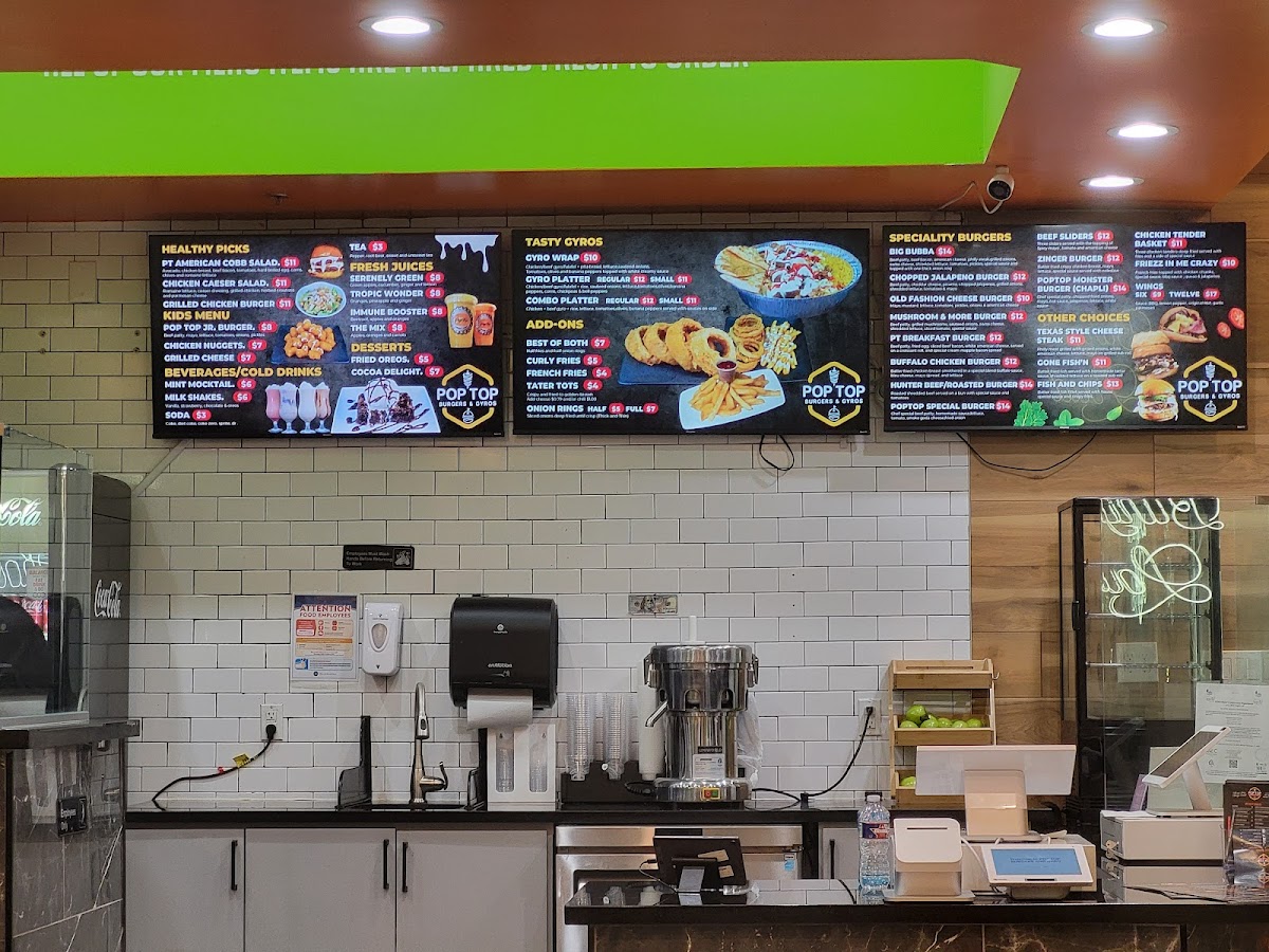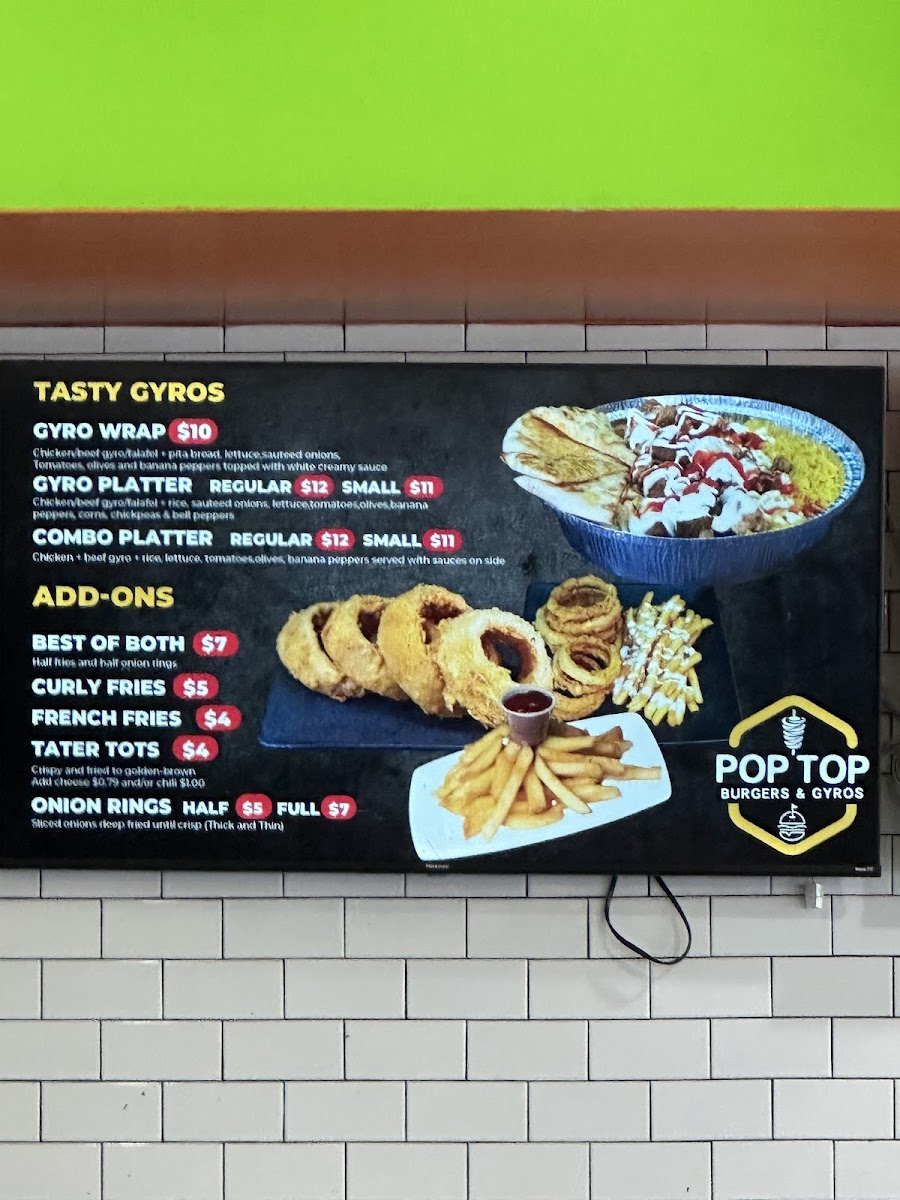 The sides are equally enticing, with crispy onion rings and perfectly seasoned curly fries that make for excellent companions to any meal. Friendly service complements the delightful atmosphere, making it a great spot for gatherings or casual dining. Overall, Pop Top Burgers & Gyros stands out not just for its diverse menu but also for the quality and freshness of its offerings. Don't miss out on this culinary experience!